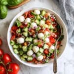 A fresh and vibrant Tomato Cucumber Mozzarella Caprese Salad combining diced tomatoes, Persian cucumbers, mini mozzarella balls, and a flavorful garlic olive oil dressing, finished with fresh basil for a delightful and easy-to-make summer salad.