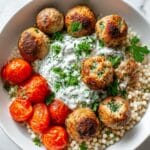 This recipe for Turkey Meatballs with Couscous is a quick and flavorful meal perfect for busy weeknights. Lean turkey meatballs pair wonderfully with light couscous, fresh cherry tomatoes, and creamy tzatziki sauce for a balanced and satisfying dish.