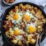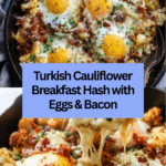 This Turkish Cauliflower Breakfast Hash is a flavorful and hearty morning dish featuring a fragrant blend of spices, crispy bacon, tender cauliflower, sautéed peppers and onions, topped with cheesy baked eggs and fresh parsley. It’s a savory and satisfying way to start your day with Middle Eastern-inspired flavors.
